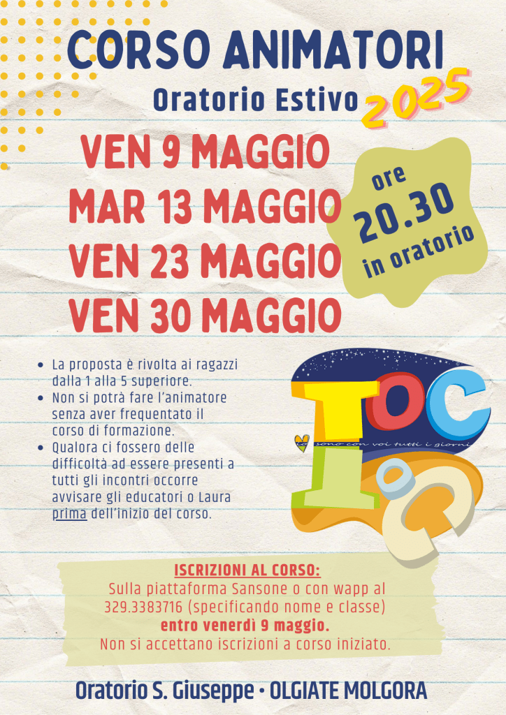 Dopo avere compilato il modulo stampalo, firmalo e portalo in Oratorio giorni dei apertura della segreteria MERCOLEDÌ 7 E 14 MAGGIO dalle ore 16.15 alle 18.00 o venerdì 16 maggio dalle ore 20.00 alle 21.30.